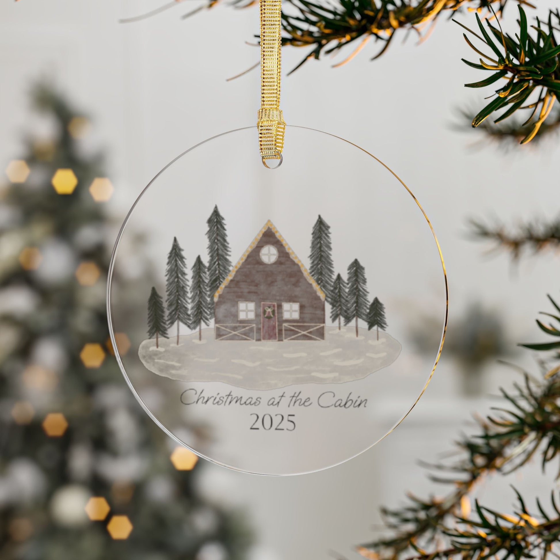 A quiet tribute to winter’s embrace. This clear acrylic ornament features a soft watercolor cabin scene with “Christmas at the Cabin 2025” — a gentle reminder of snow-dusted mornings, fireside gatherings, and the stillness of nature.