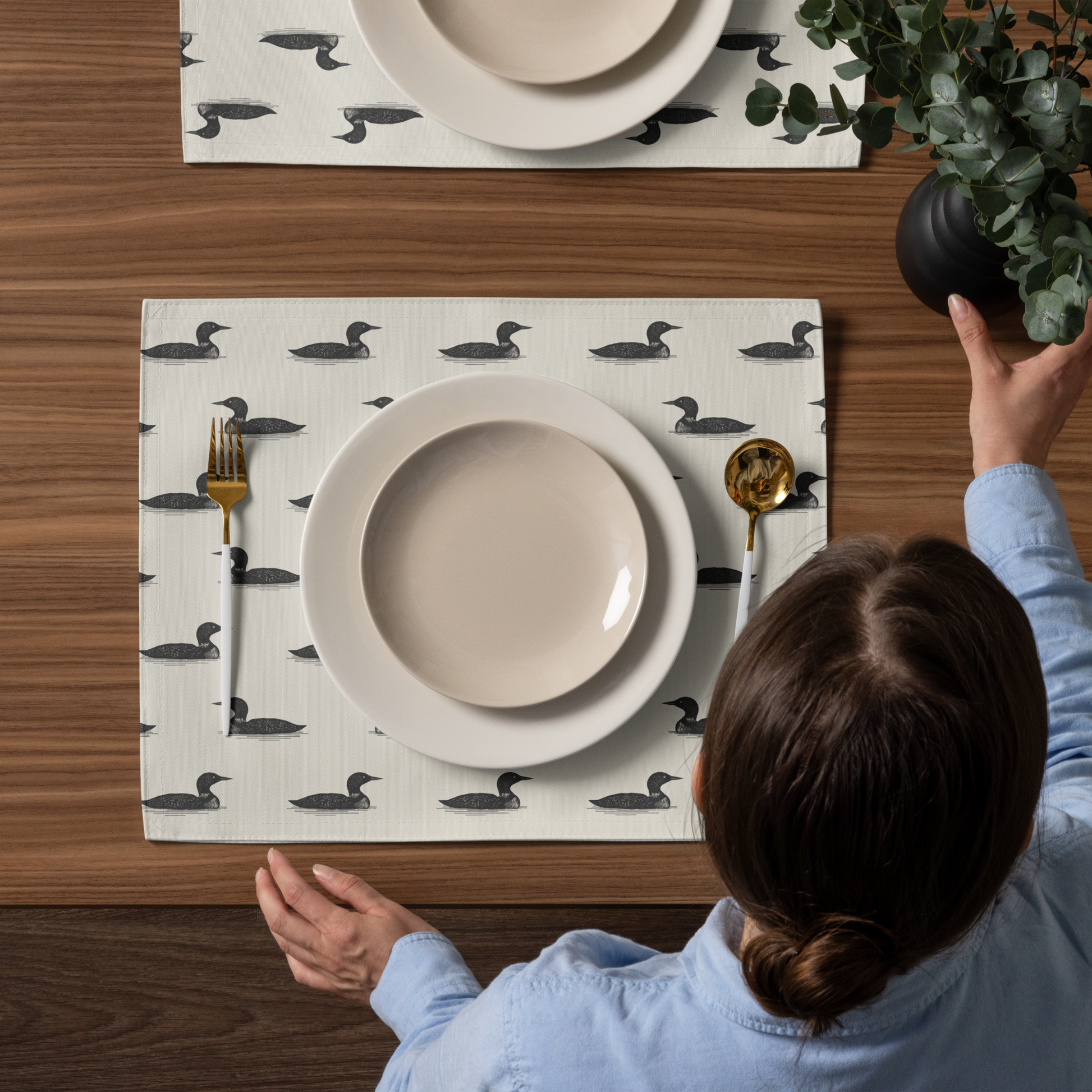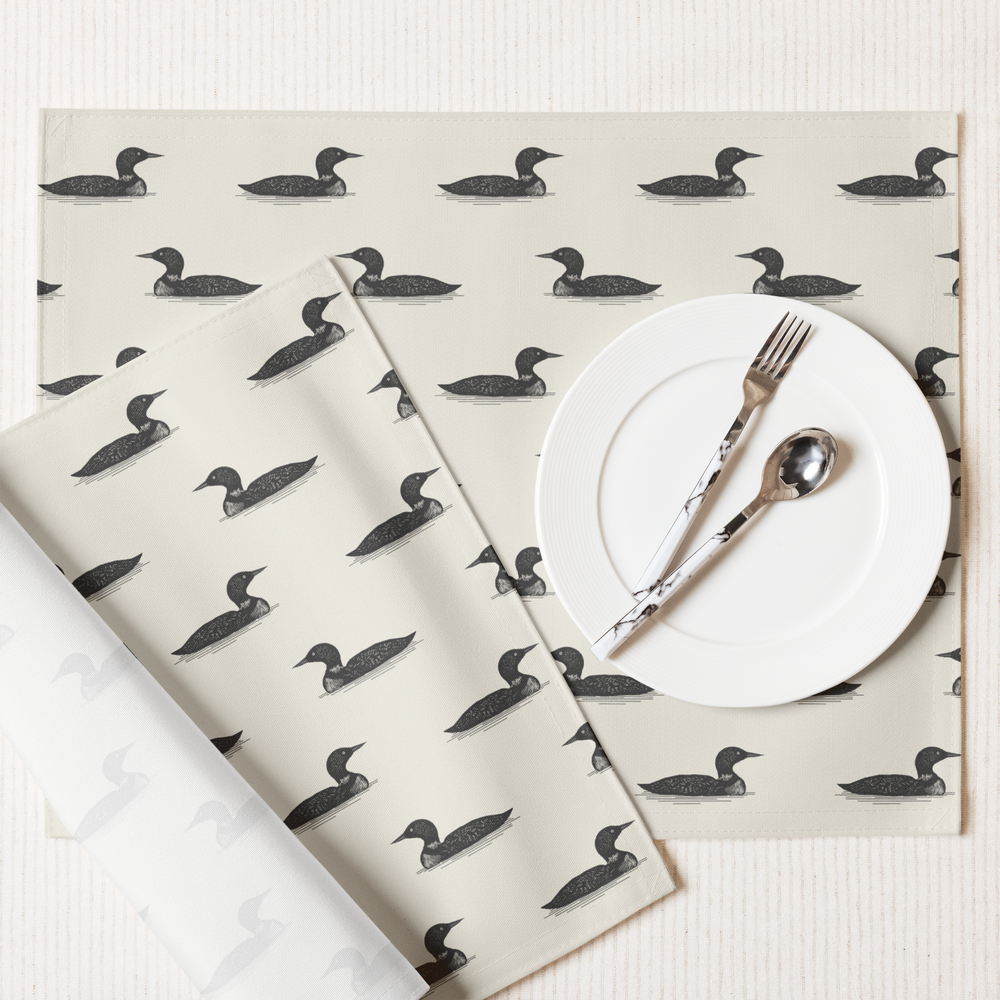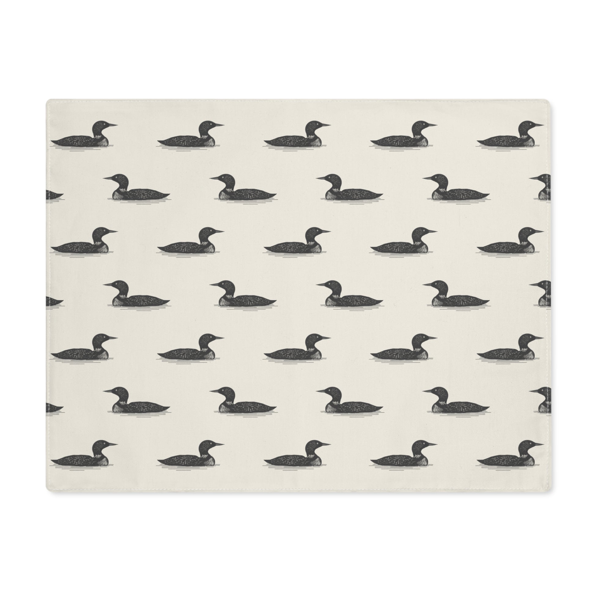 A quiet nod to lake life and lingering meals, The Driftloon Placemat brings gentle movement and nature-rooted charm to your tabletop. Featuring a one-sided loon motif print with a natural cotton back, this made-to-order placemat evokes the hush of still waters and the rhythm of intentional living.